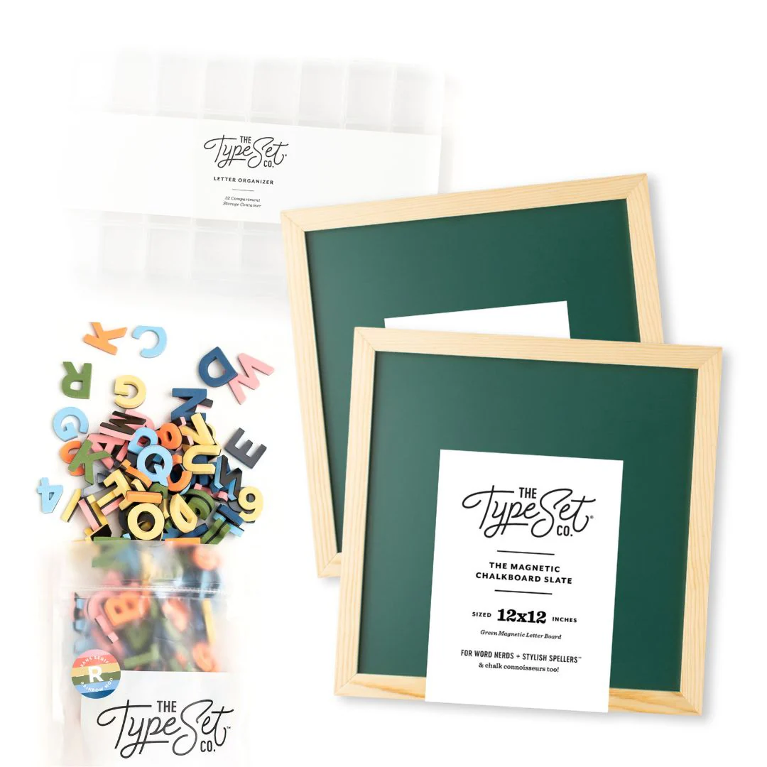 Create those memorable first day photos with out first day of school chalkboard bundle for siblings! Includes TWO 12x12 magnetic boards, one 200-piece set of 1-inch magnetic letters in the rainbow color of your choice, and a convenient organizer to keep everything in tidy! Designed for busy moms. Also great for year round letter learning and fun!